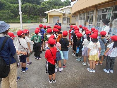 校長先生に「行ってきまーす」と元気にあいさつして出発です。暑さが心配でしたが、空は丁度いいぐらいに曇って、1年生のたんけんを応援してくれているようです。