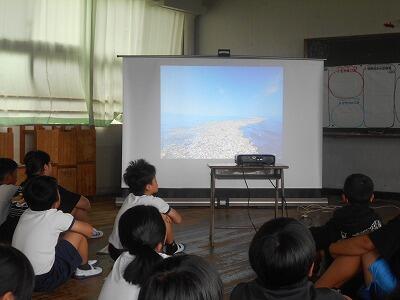 最初にスライドを見て学習しました。「太平洋にはゴミが流れて集まっている所があり、そこを太平洋ゴミベルトと言います。」「延岡市のゴミは一日、約4万トン集まります。これはつなげると延岡市から宮﨑駅に届く量です。」先日、クリーンセンターとゲン丸館を見学し、社会の授業でもゴミ処理について学習している4年生のみんなですが、初めて知ることがたくさんありました。