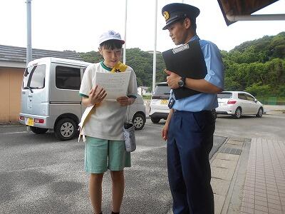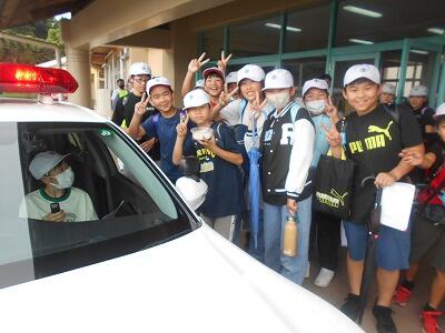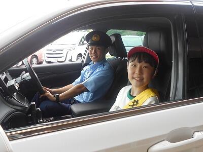 「交通ルールやマナーを守って、安全に下校しましょう。」児童玄関前に停めたパトカーに6年生の代表児童が乗り込み、下校中のみんなに呼びかけてくれました。