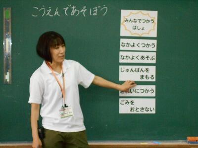 出発前に「仲良く遊ぶ」「遊具は順番を守る」「ゴミを散らかさない」「ハチなどの虫に気をつける」など、公園で楽しく遊ぶために注意することを確認しました。みんな進んで発表できました。