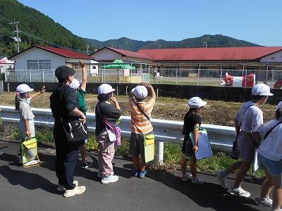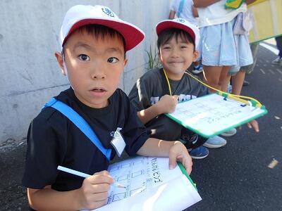学校の周りにはいろんなお店や標識、横断歩道、橋や用水路などがあることが分かりました。チョウチョやカニ、アジサイの花など、自然の豊かさにも気づくお友達もたくさんいました。1年生は公園にも探検に行く予定です。次はどんな発見があるかな?