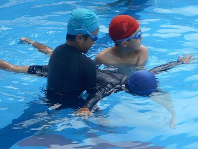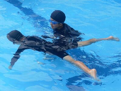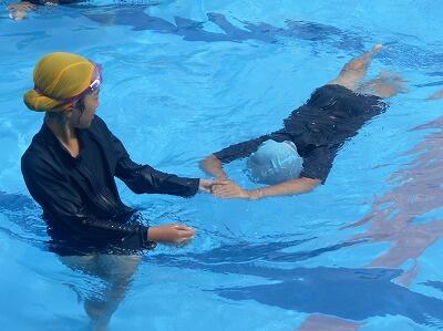 入水の仕方を確認し、中にゆっくり入りました。「先生、ちょうどいいです。」「気持ちがいいです!」水温は冷たくなく、みんなのびのび学習できました。水中じゃんけんなどの水慣れをしたら、だるま浮きやアメンボ浮きなどをペアになって練習しました。サポートの仕方も手を貸しすぎないぐらいにできて、とても上手でした。