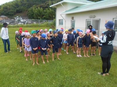 はじめの会では、「プールサイドを走らないこと」「ふざけないこと」「話をしっかり聞くこと」の三つの約束を確認しました。