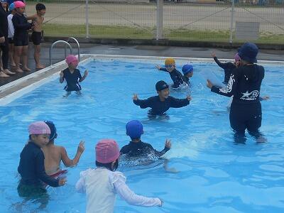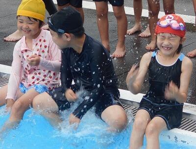 プールサイドでお隣の友達と水を掛け合ったり、足でバシャバシャしたり、水慣れを上手にできました。「冷たくて、気持ちい~い!」