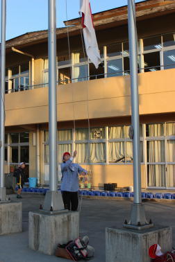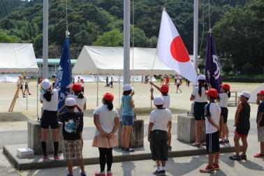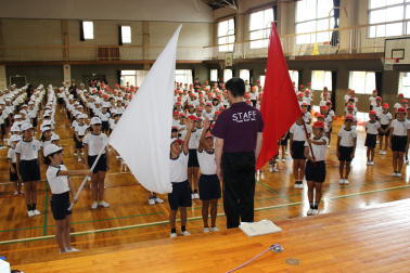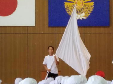 赤団団長西森君と白団団長伊東君の手に、団旗がしっかりと受け渡されました。