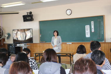 贈呈式では、まず、柳田貴子様がベルマーク運動についてお話をされました。