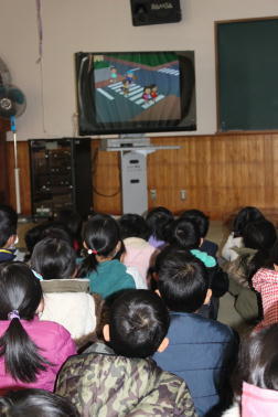 低学年は、多目的室で交通安全に関するビデオを視聴しました。