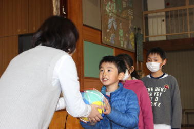 そして、各学級の代表児童に、ソフトドッジボールを渡されました。