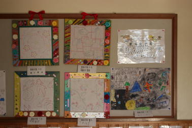 現在、職員玄関前の掲示板に、学習教室の皆さんの作品が飾ってあります。