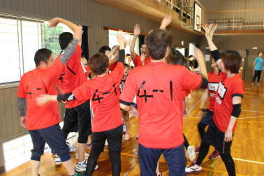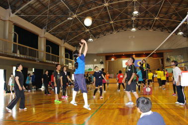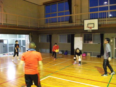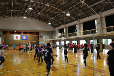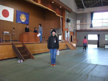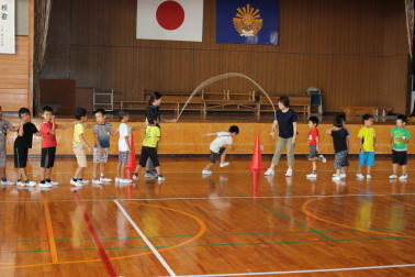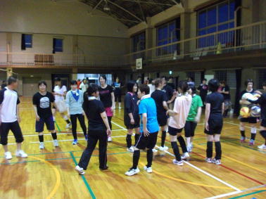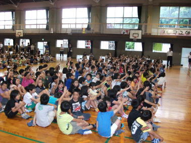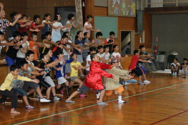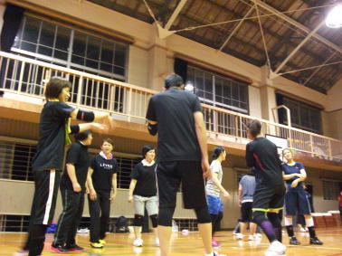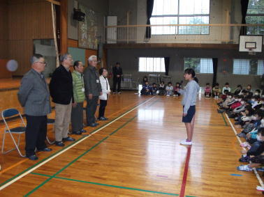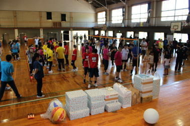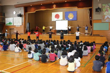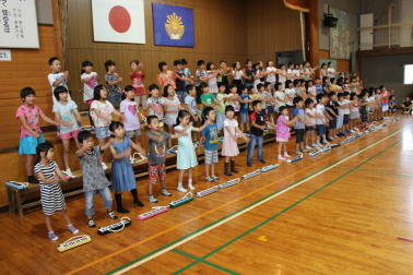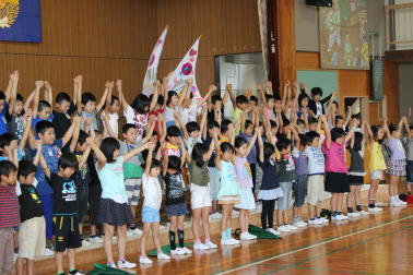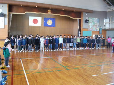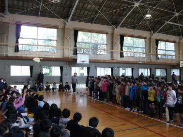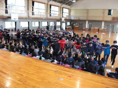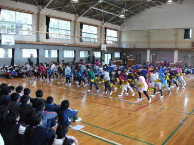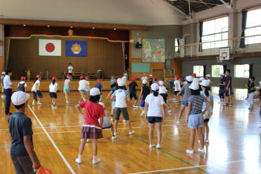 体育館で5年生と6年生が向かい合い、互いを意識しながら練習しました。