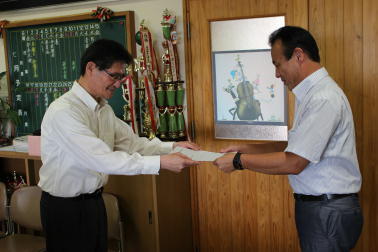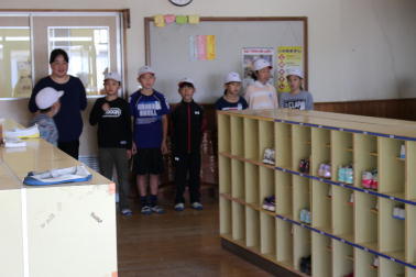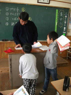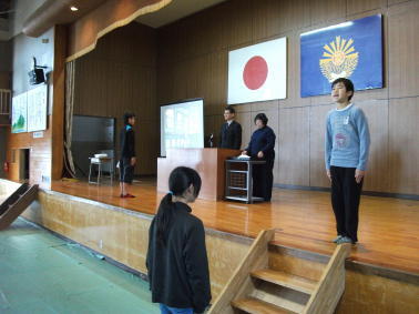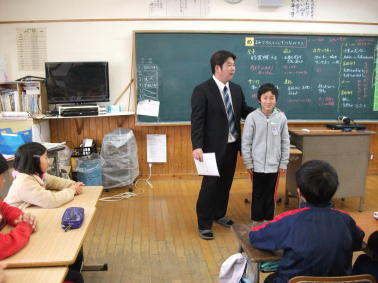 修了式では、1年生高木君、2年生山口君、3年生松田君、4年生中川君、5年生伊藤君がそれぞれの学年を代表して修了証(通知表)を受け取りました。