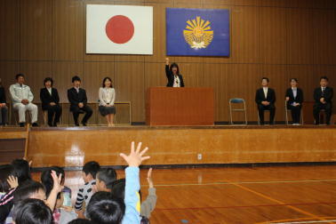 新しく本校に赴任された10名の先生方を迎え、6年生の齊藤さんが歓迎の言葉を述べました。