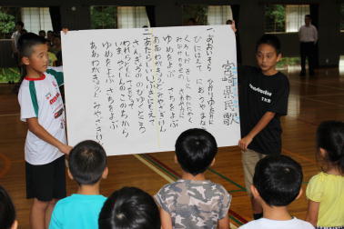 現在、朝の会で子どもたちが歌っている今月の歌は“宮崎県民歌”です。