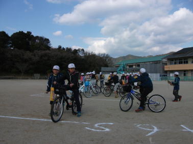 3・4校時は3年生以上を対象に、運動場で実際に自転車に乗って、道路での安全な自転車の乗り方について学びました。