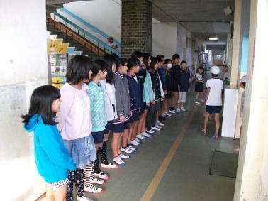 1、3、4、6年生の学級がある北校舎玄関で、6年1組のみなさんがあいさつ運動に取り組んでいました。