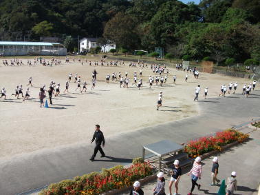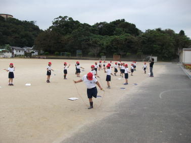 秋も深まり行き、運動場で1年生が縄跳び運動に取り組んでいました。