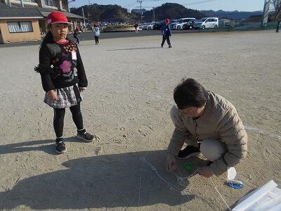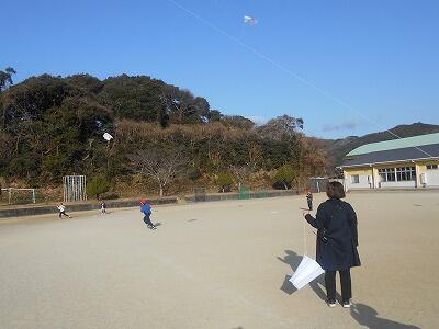 1月27日(火) 1年生が凧あげに挑戦しました! 運動場に自慢の凧を持って颯爽と繰り出してきたみんな、「よーし、高くあげるぞ~っ」と意気込んでいました。