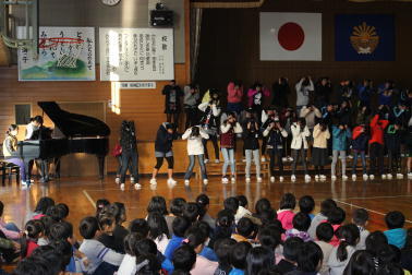 音楽集会(6年生) 投稿日時 : 2016/12/08 東海小学校 職員 昨日の朝の活動は音楽集会でした。6年生が「ちこたん」という歌を、振り付けを加えながら発表しました。どの学年の子どもたちも、くいいるように見つめていました。いつまでも心に残る発表でした。
