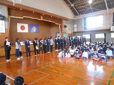 新しく来られた14名の先生方の紹介に続き、いよいよ担任発表が行われました。「担任の先生は誰かな?」と、子どもたちの視線は釘付けです。発表の瞬間、体育館には歓声や拍手は沸き起こ、、、らずに、心の中で思いを表現していた子どもたちです。