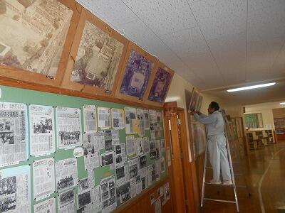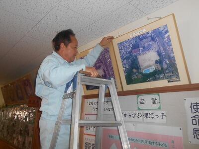 3月3日(火) 校長室に保管されていた学校の航空写真を、技術員の先生が校長室前の廊下の壁に設置して下さいました。