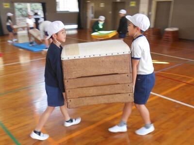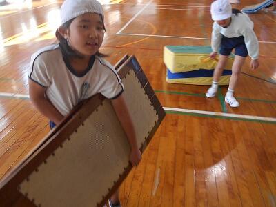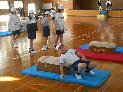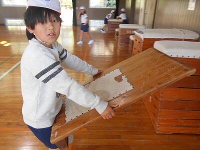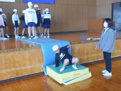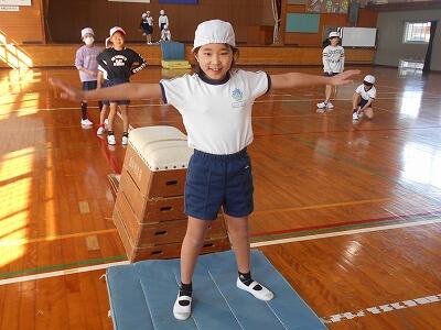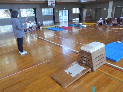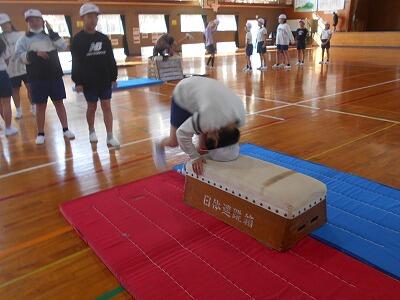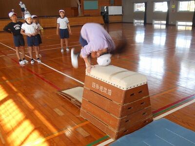 次は跳び箱での練習。跳び箱の高さを変えて、子ども達が自分の能力にあった場所で練習できるように工夫して下さっていました。子ども達は自分の出来具合を確認しながら、意欲的に練習していました。お互いにアドバイスする姿もあって、とてもいい練習ができていました。