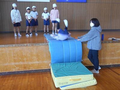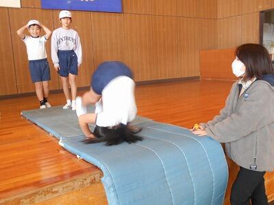 マットで十分に前転の練習をした後、ステージを利用して、前転し台から降りる際の感覚をつかみます。両手をしっかりと付くこと、頭は後頭部を付くようにすること、ゆっくりと真っ直ぐ回ることなど、子ども達の様子を見ながら先生が的確なアドバイスをして下さいます。 高さがありますが、みんな安全に回り降りることができていました。