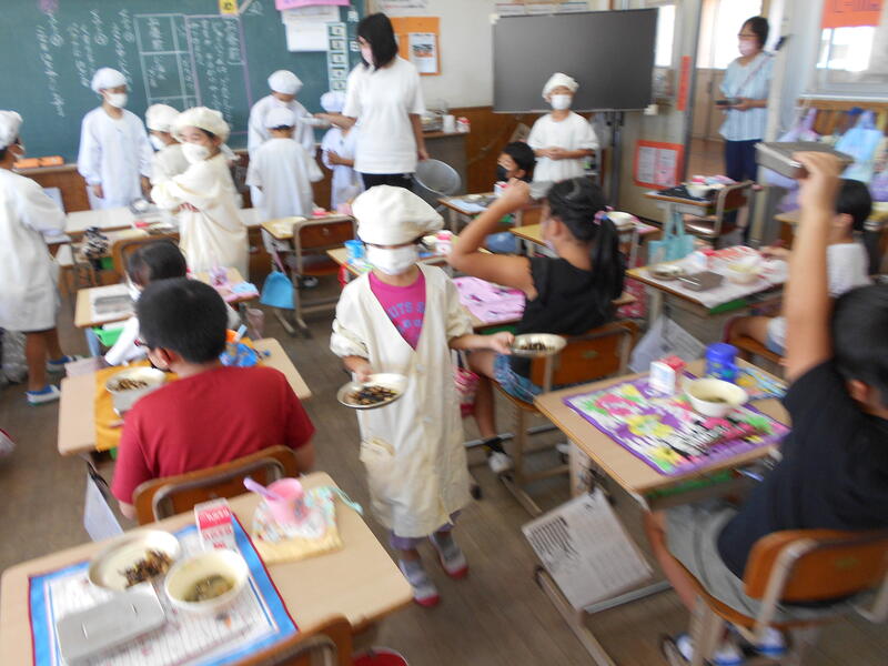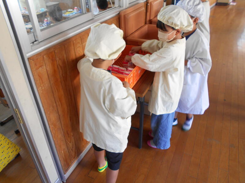 2年生の各学級の給食当番は、1学期は5年生主体でしたが、2学期から、2年生主体となっています。子ども達の様子を見ていると、ご飯やおかずを慎重に運んだり、足りないものはないか気を配りながら当番を務めている様子が窺えます。少しだけ5年生に手伝ってもらっていますが、2年生の給食当番も板についてきました。協力し合ってがんばって働く姿から、夏休みを挟み、随分成長したように思います。