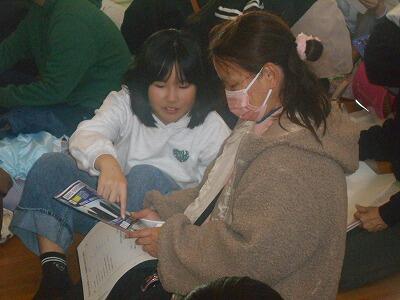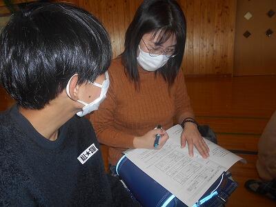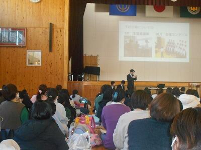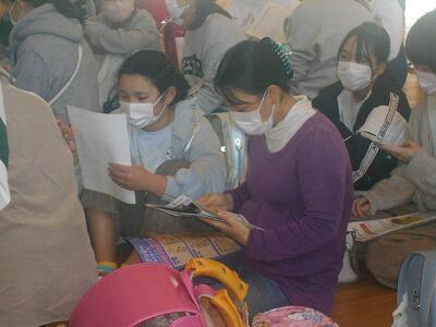 体育館へ移動して、お家の人と一緒に資料を見ながら説明を聞きました。