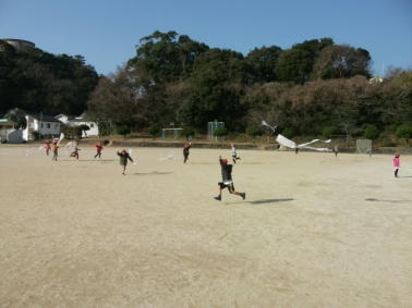 そんな中、1年生が運動場でたこ揚げを楽しんでいました。