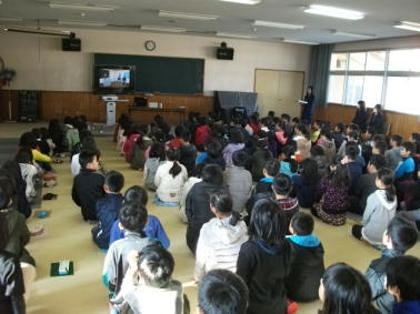 低学年は、多目的室で交通安全に関するビデオを視聴しました。