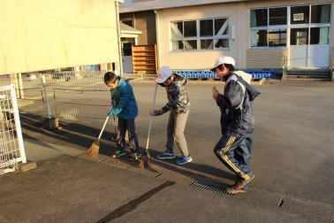 朝陽を浴びて、6年生が落ち葉を掃いていました。