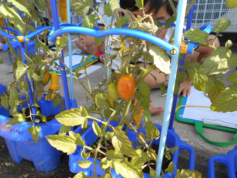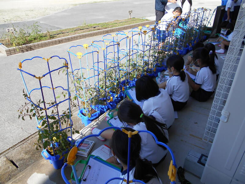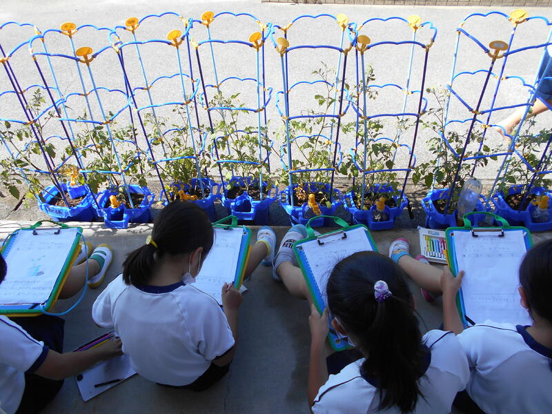 2年生は、生活科の学習でトマトを育てています。太陽の光をいっぱい浴び、トマトは順調に育っています。国語科「かんさつ名人になろう」で,子ども達は自分のトマトを真剣なまなざしで見つめ、学習プリントに絵や感想を記入していました。今後もトマトを活用し、生活科や国語科の学習を進めていく予定となっております。