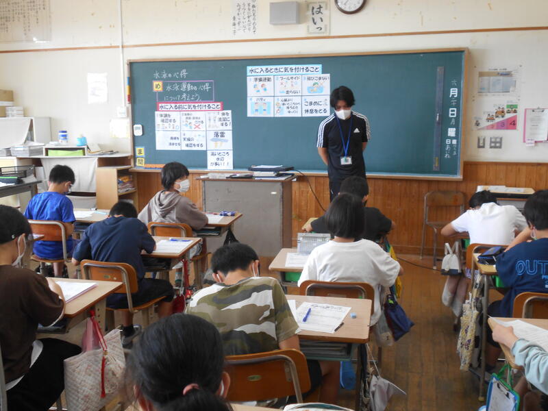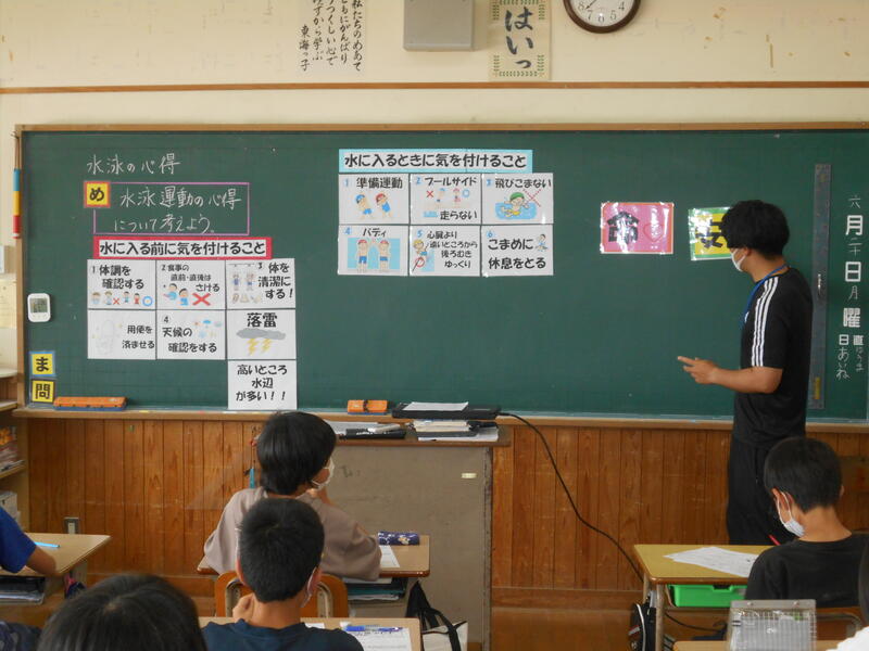 6月27日(月)から始まる水泳の授業に向け、今週、全学級で「水泳運動の心得に関する指導」を行います。ねらいは、水泳運動の心得を適切に指導し、水の事故を未然に防ぐことや自他の命を守る行動をとる態度を育てることです。授業では、安全面での心得や、新型コロナウイルス感染症対策に関する約束事項、水難事故防止に関わる内容を学習します。児童にとって楽しい水泳の授業になるよう取り組んでまいりたいと思います。