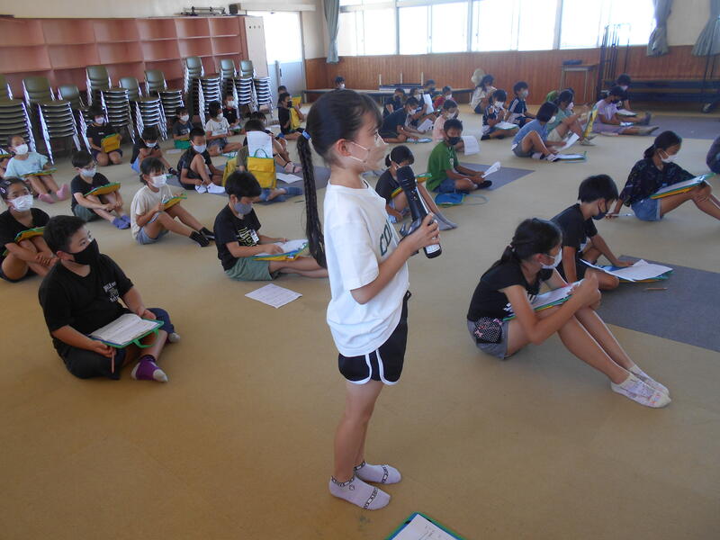 全校集会が行われ、2年生が「はらぺこあおむし」の合唱、5年生が「竹取物語」と「平家物語」の群読を発表してくれました。2年生は、絵本の中の情景を小道具等を用いながら歌で表現してくれました。大変元気でかわいらしい発表でした。5年生は、高学年らしくしっかりとした姿勢で、全員で声を合わせ、堂々と発表してくれました。さすが5年生という発表でした。今回は、コロナウイルス感染症拡大防止の観点から、オンラインでの発表となりました。