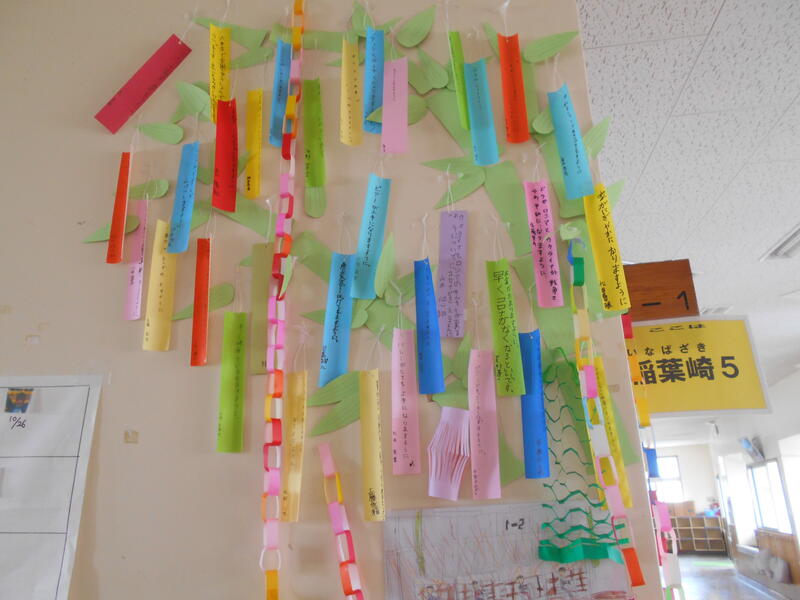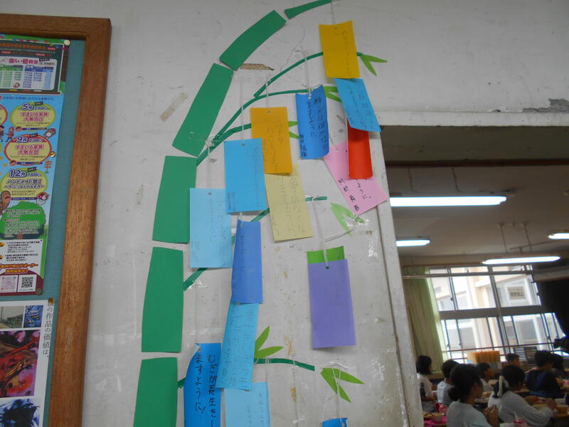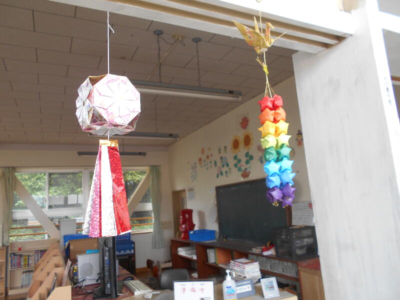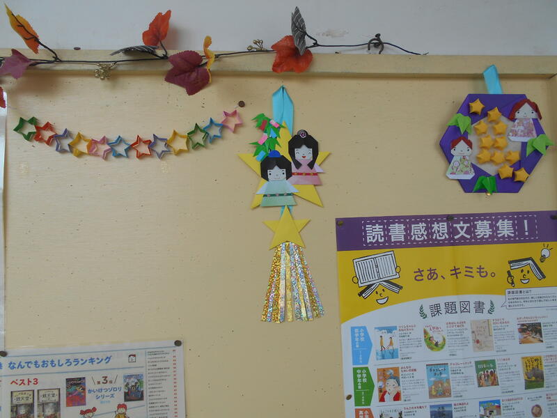 明日は七夕です。5年生と6年生の廊下には七夕飾りが飾ってあり、短冊にはいろんな願い事が書かれていました。また、図書室にはスクールサポートスタッフの西山先生が作ってくださった七夕飾りが飾ってあります。台風の後あまり天気は良くありませんが、明日は天の川が見えるといいですね。みんなの願いが叶いますように。