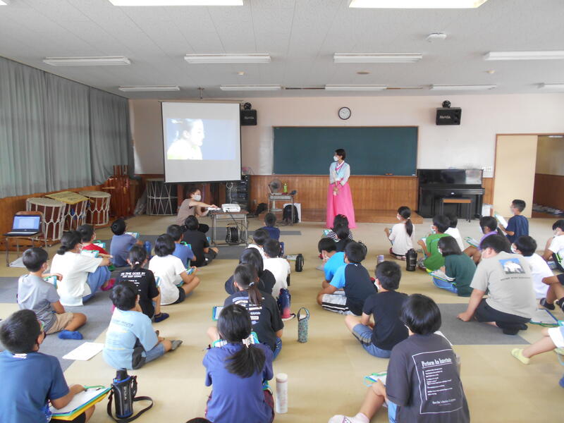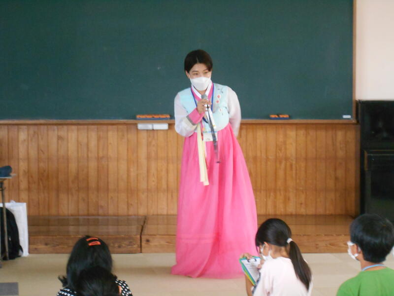 5年生の総合的な学習の時間に、宮崎県国際交流員のキム・ヘジュンさんをお迎えし、国際理解講座を実施いたしました。講座では、韓国の基本情報や食文化等について、クイズや映像も交えながら楽しく紹介していただき、子ども達も興味を持って話しを聞いていました。また、韓国の伝統ゲームである「ユンノリ」の体験では、各グループ大変盛り上がり、ゲームを楽しむ姿が見られました。わずかな時間でしたが、隣国である韓国の文化に触れ、5年生にとって大きな刺激になったと思います。今後ますます国際化が進むなか、国際理解につながるよい機会となりました。