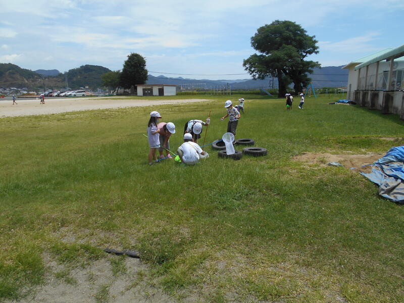 2年生の生活科では身近な生活の場にいる、虫などの小さな生き物に関心をもち、進んで探したり育てたりして、生命の大切さに気づき、生き物を大切に育てる心を養う、「みんな生きている」を学習しています。今日は、学校の敷地内の生き物探しに、暑い中、友達と協力しながら一生懸命取り組んでいました。この学習が、3年生からの総合的な学習の時間や理科などの教科に結びついていきます。この学習で学んだこと、興味・関心をもったことを、今後の学習に生かしてほしいと思います。