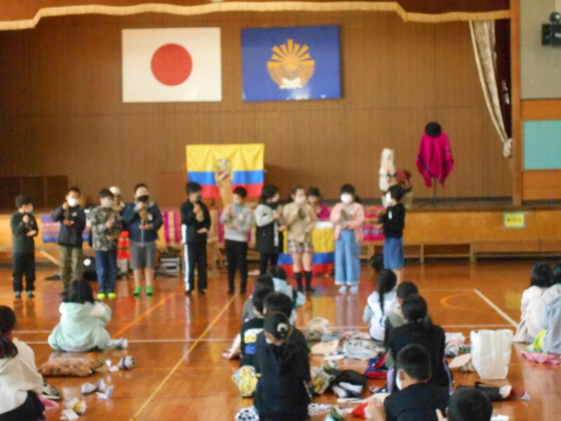 南米民族音楽グループINTIによる鑑賞教室を行いました。演奏のほか、「アウトゥクトゥナ」(2人以上でアンデスの楽器、サンポーニャを交互に吹き一つの曲を完成させる伝統の演奏法)の紹介やエクアドル共和国の紹介、民族楽器体験などがありました。民族楽器体験では、代表児童がアンデスの打楽器を使い、リズムに合わせて一緒に演奏を楽しんでいました。聞き慣れない民族音楽を肌で感じ、本校児童にとって貴重な体験になりました。INTIの皆様、本日はありがとうございました。