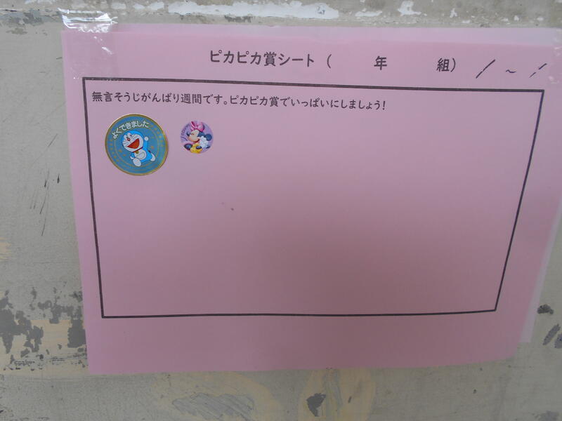 今週から、無言清掃強化週間に取り組んでいます。現在、5年生・6年生をリーダーに、縦割り清掃に取り組んでいますが、リーダーを中心に日々無言清掃に取り組んでいます。強化週間の期間は先生方が各清掃場所を点検し、無言清掃ができている場所については、シールを貼っていくことになっています。清掃をつうじ、「ともにがんばり うつくしい心」を育んでほしいいと思います。