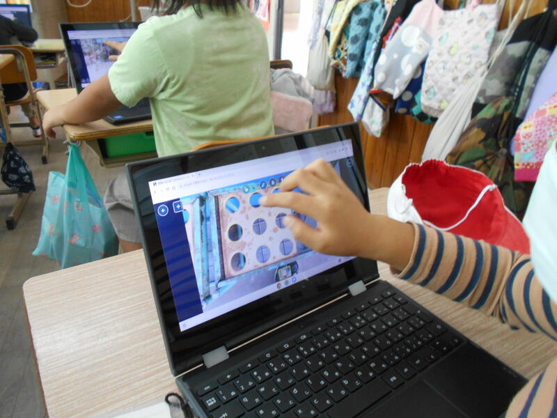 本日は、午前中の特別校時での授業でした。2年生の教室では、タブレットを活用し、身近な物を活用した算数のかけ算の問題をつくる授業に取り組んでいました。石ころを並べてかけ算の問題をつくる子ども、グランドの遊具を活用して問題をつくる子どもなど、タブレットで写真を撮り、思い思いに問題づくりにチャレンジしていました。また、5年生の家庭科の時間では、ミシンを使い、エプロンづくりに取り組んでいました。慣れないミシンを使い、次々にエプロンを完成させていました。なかには、指導に来られていた業者の方に、ミシン縫いを褒められる子どももいました。子ども達は今日もいろんな授業にがんばって取り組んでいました。