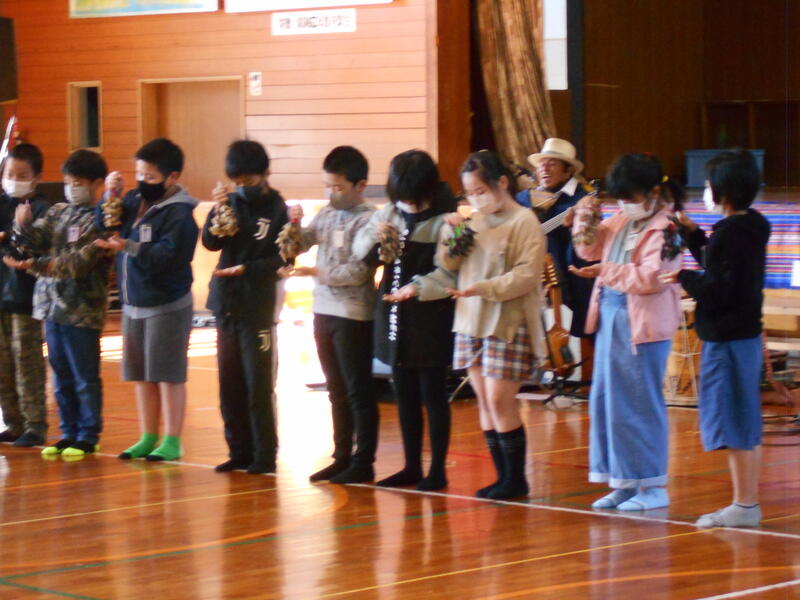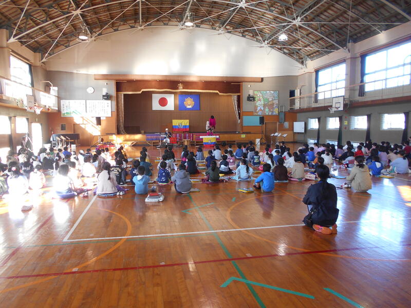 南米民族音楽グループINTIによる鑑賞教室を行いました。演奏のほか、「アウトゥクトゥナ」(2人以上でアンデスの楽器、サンポーニャを交互に吹き一つの曲を完成させる伝統の演奏法)の紹介やエクアドル共和国の紹介、民族楽器体験などがありました。民族楽器体験では、代表児童がアンデスの打楽器を使い、リズムに合わせて一緒に演奏を楽しんでいました。聞き慣れない民族音楽を肌で感じ、本校児童にとって貴重な体験になりました。INTIの皆様、本日はありがとうございました。
