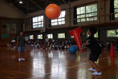 まず、団の色を決定しました。今年は、2つの風船が準備され、風船を割ると「赤団」「白団」が分かるようになっていました。それぞれの団長が風船を選び、「せーの」で一緒に割ると、中から「赤団」「白団」と書いた紙が出てきて、子どもたちの歓声が体育館に響き渡りました。