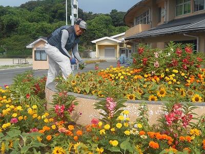 今日も技術員の先生が、暑い中、花壇の手入れをして下さっていました。大きな花壇なので、花ちぎりや草抜きなどとても大変です。ヒマワリやホウセンカ、マリーゴールドなどたくさんの花が植えられている円形花壇はとても美しく来校者の目を楽しませてくれています。