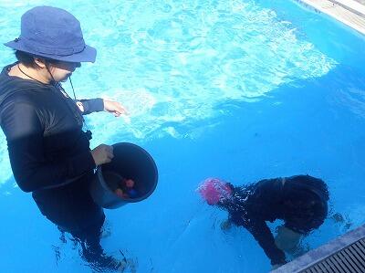 みんな大好き宝探し。思いっきりザブンと潜っている子がいっぱいです。ゴーグルを付けずに潜っているお友達を発見!「水の中で目を開けれるんだよ~」と教えてくれる子もいました。すごいなあ~