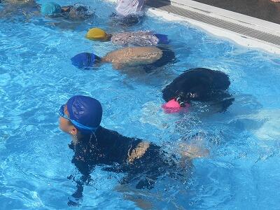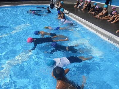 水に浮くのも上手です。くらげ、アメンボ、だるま浮き、先生から指示が出ると、すぐに反応! 水を完全にお友達にしている1年生のみんなです。