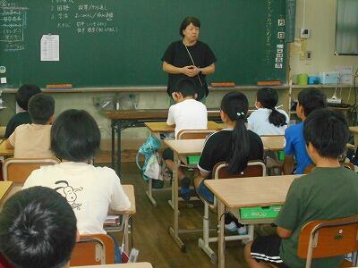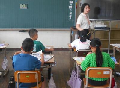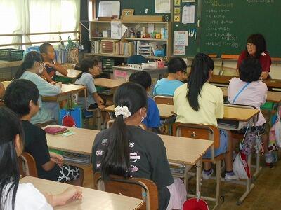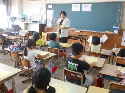 7月16日(水) 5年生の出前授業が行われました。5年生は総合的な学習の時間で地域の文化の一つとして民話について調べています。今日は「延岡の語り部・萌ぎの会」の方々に来ていただいて、延岡市、宮崎県に伝わる民話を聞かせてもらいました。方言を交えたどこかノスタルジックな優しい語り口にいつしか民話の世界へ引き込まれていきます。
