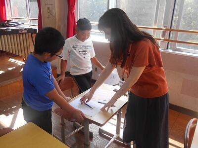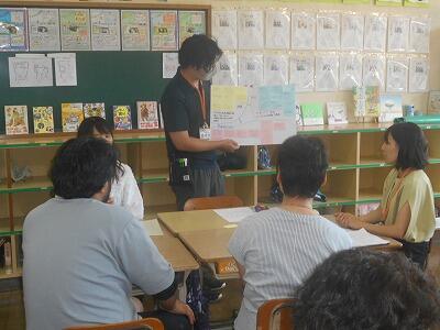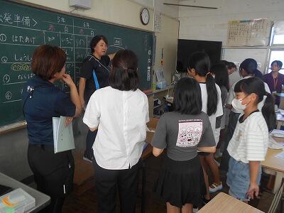 それぞれの係で担当の先生の所に集まり、仕事の内容や進め方を聞いたり、実際に練習したりしました。先生方はプレゼンテーションや図・表などの資料を準備し、実際に手本を見せるなどして、子ども達に丁寧に分かりやすく説明して下さっていました。