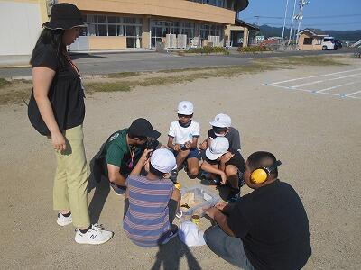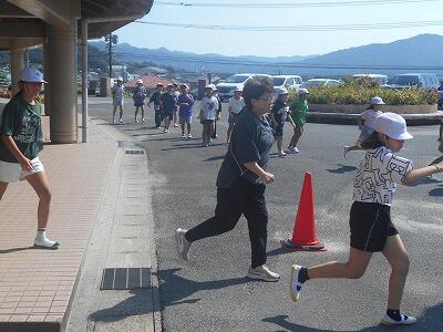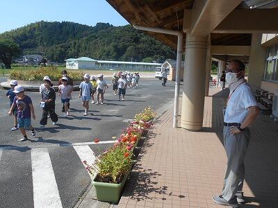 揺れが落ち着いたら、一次避難場所である運動場へ素早く避難します。どの学年もしゃべらないことや頭を守ることを意識して動けました。