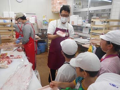 バックヤードにも潜入! 肉や魚、青果などが次々と加工されていました。ラップをして、値段ラベルを付ける機械もありました。その早業ぶりにみんなびっくりです。