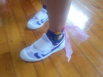 「次はリボンの足を一歩前に出すよ。」子ども達に分かりやすいように、左手、左足にはリボンが付いていました。